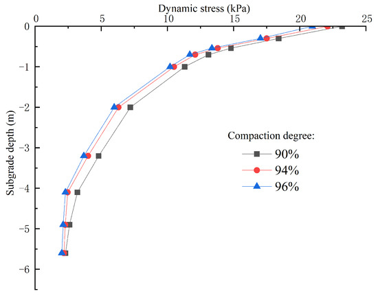 In the finite element analysis model, three different compaction degrees were set—90%, 94%, and 96%—while maintaining a load moving speed of 60 km/h and a fixed moisture content of 8%. The other parameters remained consistent. In practical engineering, three-stage control can be adopted, with detection frequencies of 50 m and 20 m, and continuous monitoring. Figure 14 and Figure 15 illustrate the variation of dynamic stress with depth and the displacement changes along the driving lane direction under different compaction degrees under simulated vehicle loading. The results were obtained through dynamic finite element simulation based on the loading conditions described in Section 3.1. Table 9 presents the dynamic stress within 6 m below the subgrade surface under different compaction degrees.