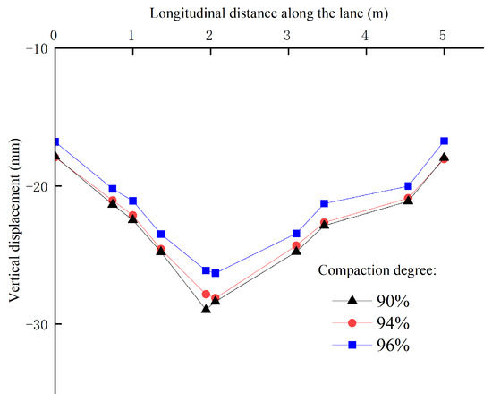 According to the data in Figure 14, the dynamic stress gradually decreases with increasing vertical depth of the subgrade, and the rate of decrease slows down. Under different compaction degrees, the dynamic stress from the subgrade surface to the bottom decreases by 93.6% (90% compaction), 94.7% (94% compaction), and 94.3% (96% compaction), respectively. Figure 15 shows that the maximum vertical displacement occurs at the center of the load application point. When the compaction degree decreases from 96% to 90%, the maximum settlement at the subgrade surface increases from 20.95 mm to 23.62 mm, representing an increase of 10.4%. This indicates that increasing the compaction degree beyond 90% has a limited effect on reducing settlement.