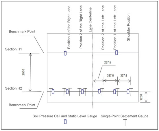 For the H1 section (at K49 + 347.5) and the H2 section (at K49 + 372.5) of the Chicao Expressway, settlement and pressure changes were observed and analyzed comparatively. Field monitoring was conducted using single-point settlement gauges to measure the absolute settlement at specific points within the subgrade, static level gauges to assess uneven settlement across the subgrade cross-section, and earth pressure cells to monitor the conditions at the bottom of the stabilized soil layer. The layout of the monitoring equipment is shown in Figure 16.