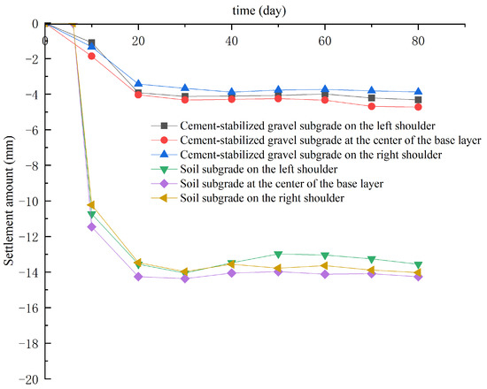 A comparative observation was conducted using cement-stabilized gravel and alluvial silty sand as the upper materials of the subgrade cushion layer. The settlement of the embankment surface during construction was measured, as shown in Figure 17: