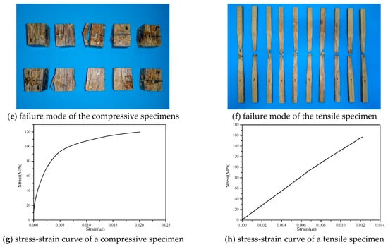 The bamboo scrimber used in this test was manufactured through hot-pressing technology, with the production process comprising round bamboo slicing, rolling into strand bundles, drying, resin impregnation, mat formation after secondary drying, and hot-pressing molding. Based on the ASTM D143-09 standard [], 10 bamboo scrimber compressive specimens measuring 30 × 20 × 20 mm were prepared for the experiments, with the length in the grain direction being 30 mm for all specimens. A further 10 tensile specimens measuring 20 × 15 × 370 mm were prepared for the tests, as illustrated in Figure 1. The mechanical properties of the bamboo scrimber were as follows: a compressive strength along the grain of 104.07 MPa, a compressive elastic modulus of 13.43 GPa, a tensile strength along the grain of 149.62 MPa, and a tensile elastic modulus of 16.81 GPa. Table 1 displays the test results.