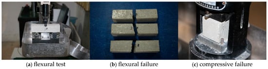 This study determined the mechanical properties of the grout following the Technical Code for the Application of Cementitious Grout (GB/T 50448-2015) []. Prior to testing, three cementitious grout cube specimens measuring 40 × 40 × 160 mm were prepared (Figure 3). First, a flexural test was conducted, followed by compressive tests on the two ends of each broken specimen from the flexural test. The grout used in the tests consisted of high-fluidity, high-strength, nonshrink cementitious grout (model H-40, Nanjing Hand Special Building Materials Co., Ltd., Nanjing, China). Table 3 displays the test results.