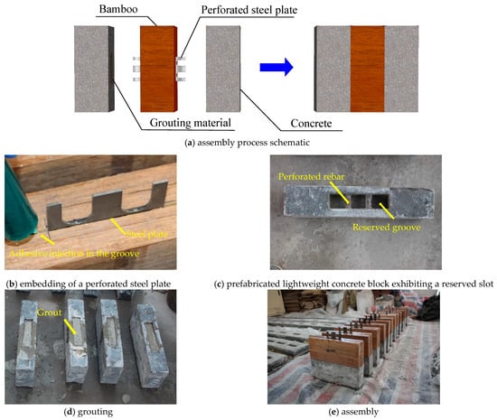 The process employed to fabricate the assembled specimen with the perforated steel plate is depicted in Figure 5, with the overall assembly process displayed in Figure 5a. As shown in Figure 5b, the bamboo block was slit, the adhesive was injected, and the perforated steel plate was pre-embedded, featuring a slit depth of 60 mm and a slit width of 0.5 mm greater than the perforated steel plate thickness. As shown in Figure 5c, the prefabricated concrete block had a reserved slot measuring 35 mm (width) × 140 mm (height) × 50 mm (depth), and the position of the embedded through-rebars corresponded to the location of the perforations in the steel plate. The cementitious grout was then injected into the concrete slot (Figure 5d). Figure 5e illustrates the assembly of the bamboo block and concrete block, with the exposed portion of the perforated steel plate pre-embedded in the bamboo block inserted into the grout during assembly.