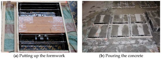 The process employed to fabricate the CIP specimen with the perforated steel plate is depicted in Figure 6. The bamboo was first perforated or slotted, after which the perforated steel plate was embedded. The bamboo block with connectors was placed into the formwork before the assembled rebar cage was positioned. Finally, concrete was cast in place on either side of the bamboo block.