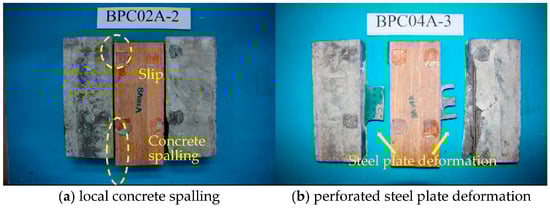 During the early loading stage, the appearance of the specimen exhibited no evident changes (Figure 8 and Figure 9). As the load rose to approach the ultimate load Pmax, the surface of the specimen did not appear damaged. However, as the load reduced to around 0.8 Pmax, the concrete began to exhibit cracks. As the test progressed, the cracks developed slowly. The damage was primarily related to the deformation of the perforated steel plate, in addition to small areas featuring concrete spalling, which led to extensive slippage between the bamboo and concrete that ultimately resulted in connection failure. The bamboo material did not exhibit significant damage, with an insignificant difference in the failure modes between the CIP and assembled specimens.