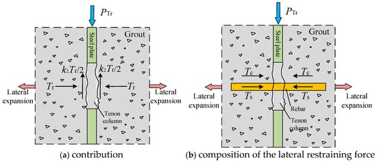 Regarding the reinforcing effect of the through-rebars, the explanation provided by Zhu et al. [] was considered clear and convincing. As illustrated in Figure 15, Zhu et al. [] reported that when the specimen was subjected to load, the concrete tenon column within the perforation exhibited a tendency toward lateral expansion, and the through-rebars contributed lateral restraint against this expansion. According to the literature [,,,,,,,], the force contributed by the reinforcing effect of through-rebars was positively correlated with the product of their diameter and strength, which could be preliminarily estimated by: