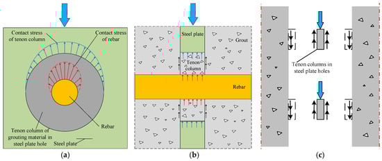 Perforated steel plate connectors in steel–concrete composite structures are commonly termed perforated rib plates or PBL shear keys as an abbreviation of the German term “perfobond leiste”, which is translated as perfobond strip. Perforated steel plates possess a higher load capacity and shear stiffness than stud connectors, and their mechanical performance indicators are less strongly influenced by fatigue loads, showing characteristics typical of rigid connectors []. Perforated steel plate shear connectors embedded in concrete have complex load paths, with multiple factors affecting their shear performance. Taking the size of the perforations as an example, both excessively large and small perforation areas will reduce the shear performance of the connectors. This can be attributed to the through-rebars undergoing flexural deformation, with an enhanced restraining effect on concrete (Figure 12). When the perforation area is too small, the presence of through-rebars will prevent coarse aggregates from entering the perforations of the steel plate. When the perforation area is too large, the proportion of area occupied by the through-rebars will decrease, reducing their ability to restrain the concrete. The shear performance of the connector declines under both scenarios [].