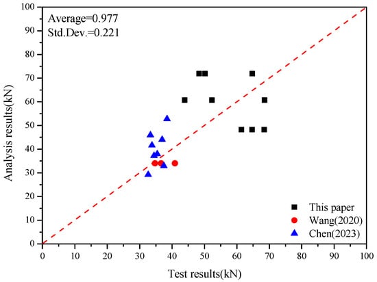 To further validate the applicability of the proposed equation, we conducted a comprehensive analysis by collecting experimental capacity data of bamboo–concrete connections with perforated steel plates from the existing literature [,]. The collected data were systematically evaluated using our proposed equation, with the calculated capacities presented in Table 9. The comparative analysis, illustrated in Figure 18, demonstrates the correlation between the calculated capacities and experimental values from the literature. Statistical evaluation reveals that the ratio of measured to calculated values yielded a mean of 0.977 with a standard deviation of 0.221, indicating that the proposed equation provides relatively accurate predictions for the shear capacity of bamboo–concrete connections with perforated steel plates.