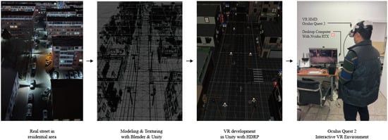 The Unity software, version 2020.3, was employed for VR project development, while Blender, version 3.6, was used for modeling and texturing. After creating a simulated street model in Unity, we rendered realistic dynamic street lighting effects in VR via Unity’s High-Definition Render Pipeline (HDRP).