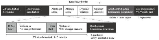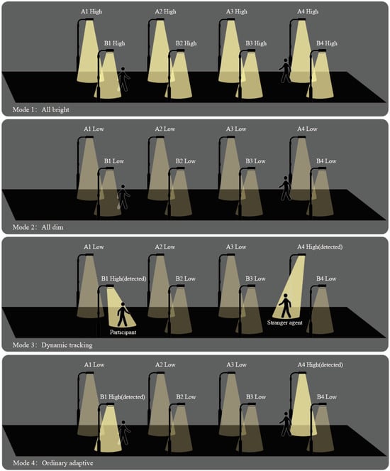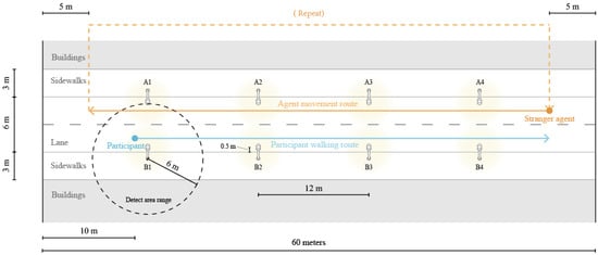 Additionally, in order to avoid tracking interference in the with-stranger scenario because of the Unity settings, we set lampposts A1–A4 to track the agent and lampposts B1–B4 to track the participant. As for how this lighting mode can avoid interference in real-world applications, we will discuss it further in the Discussion. In this part, we only focused on achieving this dynamic tracking effect in the VR environment conveniently, in order to study its impact on pedestrians’ reassurance.