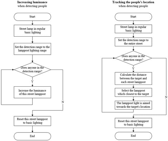 The proximity threshold for activating the lighting was set at 6 m, which aligns with the width of the road or half of the distance between two lampposts. This meant that when a pedestrian leaves the detection range of one lamppost, he or she can be detected by the next lamppost immediately, which ensures the pedestrians are always traced by a brighter light. Meanwhile, the mean illuminance of street was kept dim.