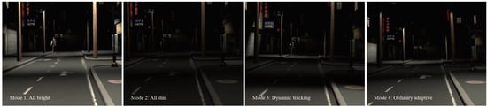In addition to tracking pedestrians’ movements, the main differences in illuminance for different lighting modes in the simulated street environment were designed. According to design of the lighting modes (all bright, all dim, dynamic tracking, and ordinary adaptive), there were two levels (bright and dim) of the illuminance. In this study, we used mean horizontal illuminance to measure different lighting levels of luminaire poles in streetlighting modes.