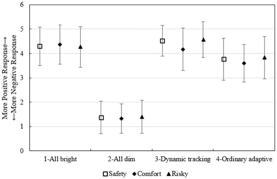 22], meaning that current ordinary adaptive street lighting still needs to be improved, which was one of the purposes of this study, as the results show that the Dynamic tracking lighting mode was better than ordinary adaptive lighting in reassuring pedestrians (H3).