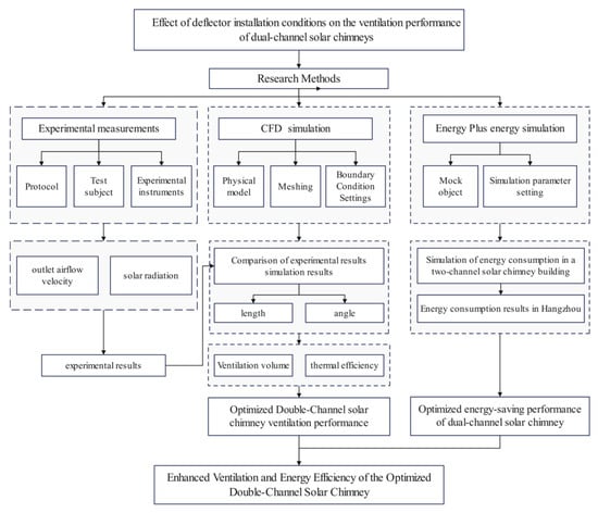 To systematically evaluate the impact of flow deflector installation conditions on the ventilation performance of double-channel solar chimneys, this study combines field measurements of a prototype chimney with numerical simulations of an identical structure using ANSYS Fluent 2021, validating and calibrating the numerical model against experimental data. A parametric analysis was conducted by establishing 12 deflector angles (γ = 0°–90°, Δγ = 5°–10°) and seven deflector lengths (l/D = 0–0.6, Δl/D = 0.1). Steady-state simulations were conducted in ANSYS Fluent to obtain the ventilation rates and thermal efficiencies for each configuration. The optimal installation conditions for the deflector of the optimized solar chimney were finally determined and applied to the building. The improvement in natural ventilation performance and the energy-saving efficiency of the optimized double-channel solar chimney were calculated. The technical route is shown in the Figure 1.