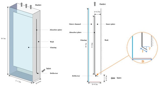 As depicted in Figure 2, the optimized dual-channel solar chimney consists of a glass cover, absorber plate, deflector, and enclosure structure. The chimney has a total height of H = 3 m, width L = 1.2 m, and depth D = 0.5 m, with an inlet of height h = 0.3 m positioned adjacent to the heat-absorbing wall, and an outlet located at the chimney’s top. The left side of the chimney features a transparent glass cover, while the right side incorporates an adiabatic wall to minimize thermal losses. Inside the chimney, a solar collector with dimensions l1 = 2.4 m (length) and L1 = 1.2 m (width) is installed. A deflector with an adjustable inclination angle and length is positioned beneath the solar collector. Solar radiation penetrates the glass cover, heating the solar collector and increasing the temperature of the air within the chimney. This thermal gradient generates a buoyancy-driven airflow, enhancing ventilation performance through increased differences in thermal pressure.