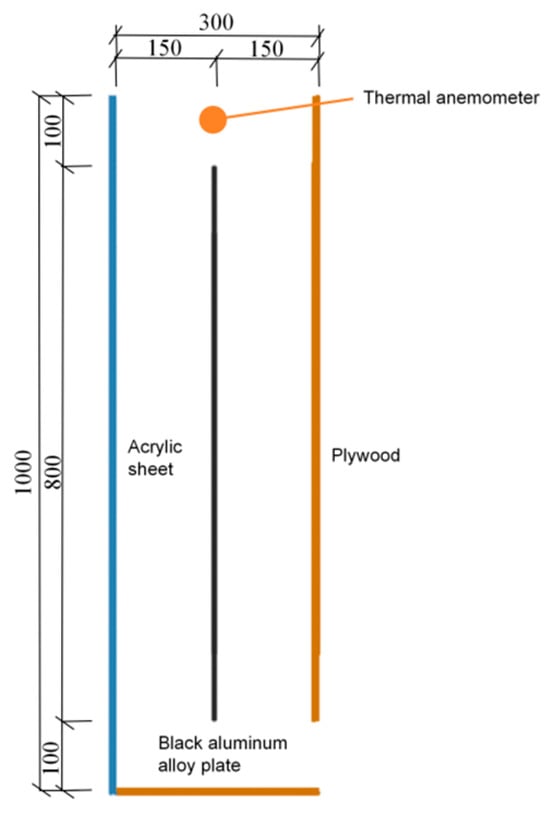 The experimental study employed the solar chimney model depicted in Figure 5 for data collection. The ventilation cavity within the chimney body had a net dimension of 1000 mm (height) × 400 mm (width) × 300 mm (depth). The chimney structure consisted of three sides constructed from 20 mm thick plywood panels and one side made of a 2 mm thick transparent acrylic panel for observational access. A central 3 mm thick aluminum alloy plate (1000 mm height × 400 mm width), coated with black spray paint on both sides to enhance solar absorption, was positioned within the chimney. The inlet and outlet openings measured 100 mm (height) × 400 mm (width) and 300 mm (length) × 400 mm (width), respectively. As shown in Figure 6, thermal anemometers were installed at the air outlet of the solar chimney, with measurement points positioned at the centerline of the chimney channel and 950 mm above the base plate. The Ruiyika solar pyranomete was mounted adjacent to the solar chimney setup, ensuring it remained unobstructed by the chimney structure during experiments to maintain the accuracy of the solar irradiance data. To minimize the impact of outdoor wind disturbances on experimental accuracy, a windbreak structure was implemented at the chimney inlet during testing.