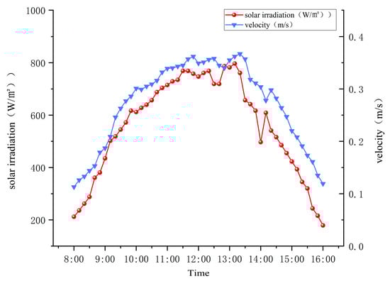 Diurnal variations in outlet airflow velocity and solar radiation intensity for the experimental setup (graph created by the authors).