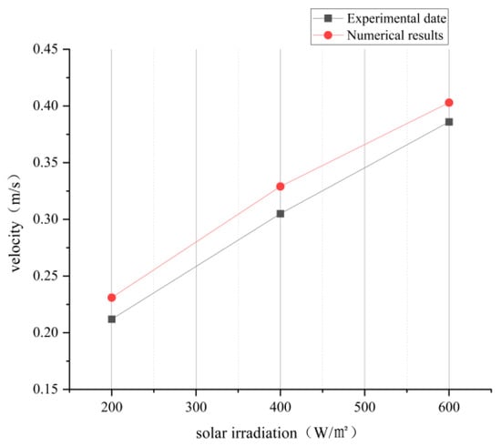 The comparison of computed velocity and the measured results is shown in Figure 8. The simulated velocities consistently exceeded the measured values, with discrepancies attributed to differences in the surface resistance of wall materials (plywood panels and aluminum alloy sheets) under actual versus idealized conditions, as well as unaccounted aerodynamic resistance at the chimney’s inlet and outlet openings. Despite these deviations, the simulated and experimental trends aligned closely, with errors controlled within 10%. This agreement validates the accuracy of the numerical framework and confirms its reliability for predicting solar chimney performance under real-world constraints.