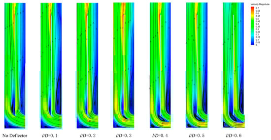 The velocity contours and streamline distributions of double-channel solar chimneys with different deflector lengths (images created by the authors).
