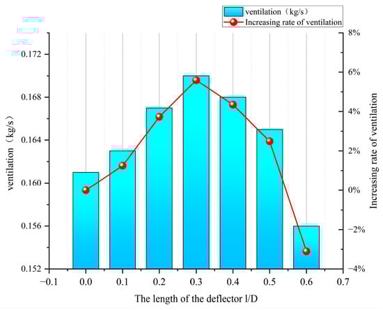 Figure 11 illustrates the variations in ventilation rate at a width of 0.6 m for double-channel solar chimneys with varying deflector lengths. A comparative analysis between the deflector-equipped configuration (l/D = 0.1) and the baseline design (no deflector) revealed that even a minimal deflector length increased the ventilation rate by approximately 1.8%. The ventilation rate exhibits a non-monotonic relationship with deflector length (l/D). As the deflector length increases from l/D = 0.1 to 0.3, the ventilation rate progressively rises. However, when the deflector length further extends within the range l/D = 0.3 to 0.6, the ventilation rate gradually decreases. At l/D = 0.6, the ventilation rate decreases to 0.158 kg/s, representing a 3.1% reduction compared with the traditional double-channel solar chimney. When the deflector length is set to l/D = 0.3, the double-channel solar chimney achieves optimal ventilation performance with the ventilation rate increasing from 0.161 kg/s (baseline) to 0.170 kg/s—a 5.59% enhancement.