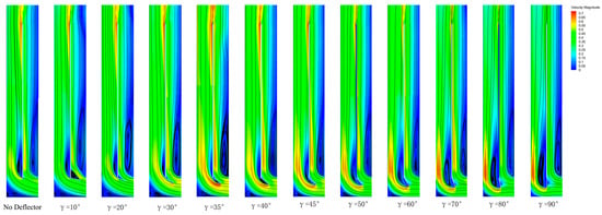 Figure 18 illustrates the evolution of vortex areas with varying deflector angles. As illustrated, the vortex area in the inner channel progressively diminishes with the increasing deflector angle γ relative to the horizontal plane. However, when γ ≥ 35°, the outer-channel vortex zone begins to expand incrementally, impairing coherent outer-channel airflow.