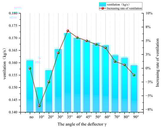 Figure 16 presents the variation in ventilation rate with deflector angle for a width of 0.6 m. The ventilation rate initially increases and then decreases as the deflector angle γ increases. For angles γ ≤ 20°, the ventilation rate remains 6.8% (γ = 10°) and 2.4% (γ = 20°) lower than that of the baseline deflector-free configuration. Peak performance occurs at γ = 35°, where the ventilation rate rises from 0.161 kg/s to 0.172 kg/s, representing a 6.8% enhancement. Conversely, at γ = 90°, the ventilation rate drops to 0.159 kg/s, 1.3% below the baseline value.