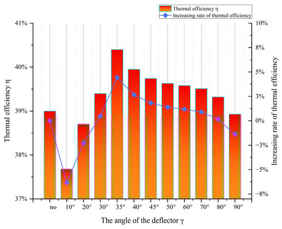 Variation in thermal efficiency with deflector angle (γ) (graph created by the authors).