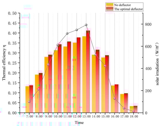 The thermal efficiency comparisons in Figure 21 reveal analogous trends. The optimized design maintains a thermal efficiency advantage of ≥3.5% across all timepoints, peaking at 41.2% under maximum solar radiation. This performance represents a 7.5% enhancement compared with the conventional system’s peak efficiency of 38.3%, demonstrating significant synergies between aerodynamic optimization and utilization of thermal energy.