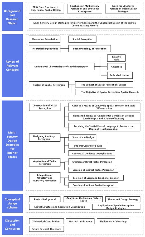 In summary, although spatial perception has received increasing scholarly attention in recent years, most existing studies focus on the macro-level phenomenological analysis, emphasizing the relationship between the human body and space. Many of these discussions remain theoretical, offering abstract insights into the senses without exploring how specific sensory elements influence spatial experiences and emotional atmospheres. This has resulted in a noticeable gap regarding the practical methods and strategies for integrating sensory elements in interior design, especially in terms of how to coordinate different modalities effectively within a spatial environment. With the development of technologies such as virtual reality, augmented reality, and sensory interaction systems, new opportunities have emerged for multi-sensory interior design. However, related research and practical applications remain limited. To address this gap, this study proposes a conceptual interior design approach grounded in the spatial perception theory. It investigates how interactions between spatial subjects and environmental conditions can inform the development of multi-sensory strategies and methods. These strategies are applied in a conceptual design case for the renovation of the Suzhou Coffee Roasting Factory. Additionally, this study explores the integration of emerging technologies to enhance multi-sensory experiences, aiming to create immersive and perceptually enriched interior environments.