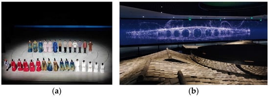 With the ongoing advancement of technology and the instability of natural light, the use of artificial lighting has become increasingly widespread in modern spatial design, commonly referred to as lighting design. Artificial lighting not only effectively supplements natural light but also imbues a space with a unique ambiance and visual experience []. Lighting design—encompassing factors such as light intensity, light source positioning, color temperature, and lighting techniques—plays a crucial role in shaping the spatial ambiance []. Based on varying light intensities, artificial lighting can be classified into two main categories: high-intensity lighting and low-intensity lighting. High-intensity lighting quickly captures attention and is commonly used in spaces such as theaters and exhibition areas where focus needs to be directed. For example, the still from the performance Only Green demonstrates how a concentrated spotlight disrupts the surrounding darkness to guide attention and heighten spatial tension—an effective application of visual dominance in sensory design (Figure 4a). In contrast, low-intensity lighting offers a softer feel and is ideal for spaces such as homes and art galleries, where a warm and tranquil atmosphere is desired. The color temperature of light influences the emotional experience of a space []. Cool light (low color temperature) often evokes a sense of calm and coolness, while warm light (high color temperature) creates feelings of warmth and relaxation. With the increasing demand for immersive spatial experiences, recent lighting design has integrated technology, giving rise to a series of interactive light and shadow immersive environments. These innovative spatial experiences go beyond static art displays, actively engaging the audience in the creative process of light and shadow interaction. For example, the Suzhou Life and Color Museum employs voice-activated light projection to transform static environments into dynamic landscapes. This integration of multi-sensory stimuli—visual, auditory, and spatial—reflects the principles of emotional resonance and embodied spatial perception discussed earlier (Figure 4b).