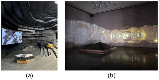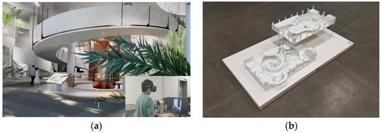 Scale variation and its influence on spatial perception in the Taicang Art Museum. (a) Interior corridor proportions enhance spatial flow and immersive experience. (b) Exterior layering and volume shifts create dynamic human–space relationships. Source: images (a,b) have been authorized for use by the author Tian Fangfang.