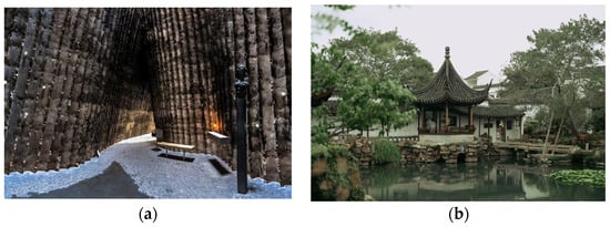The use of natural elements in interior design is crucial for shaping the atmosphere. Light, water, and wind, as the most common natural elements, profoundly influence the emotional ambiance of a space through their physical properties []. Light, particularly natural light, serves as a crucial tool for expressing the emotional tone of a space. Numerous studies on lighting in interior spaces have shown that factors such as light intensity, direction, and color temperature directly influence spatial perception, thereby affecting the emotions and behaviors of space users [,,]. The interplay between light and space breathes life into material forms, enabling the emotional hues of a space to unfold []. Natural light is typically variable, whereas artificial light can be precisely controlled, aiding in the creation of the ideal spatial atmosphere []. Water, as a natural element, plays an indispensable role in shaping the spatial atmosphere through its dynamic and static changes. The mirror-like reflection, fluidity, and integration with the environment of water add depth and layers to a space. In Zen-inspired spaces, water conveys a tranquil and solemn atmosphere [], while in commercial spaces, it evokes feelings of elegance and prestige. In addition, although wind is difficult to perceive directly, the sounds of or changes in airflow associated with it can profoundly affect spatial perception. Particularly, the interaction between wind and architectural structures can create unique spatial acoustic effects, which are well exemplified in traditional Jiangnan gardens []. The “Wind Sound Cave” in the Ge Garden of Yangzhou, Jiangsu Province, China, serves as a typical example, where the interaction between wind and spatial structure creates a unique acoustic landscape with a distinct atmosphere.