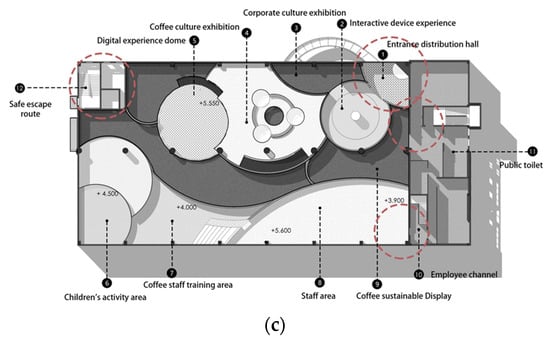 Spatial permeability and depth refer to the intentional connection of different spaces without fully relying on physical walls for separation, thereby enhancing the sense of spatial layering. In his definition of interior rooms, Wright utilized multiple boundaries and blurred spatial layers, enabling the overlap and interpenetration of different spaces []. Through this design strategy, the flow between spaces is encouraged, enhancing the perception of continuity and visual complexity. Spatial permeability breaks down strict spatial boundaries, altering the perception of boundaries and scale and allowing participants to discover and experience different layers within a continuously flowing space.