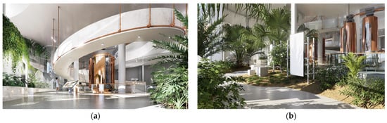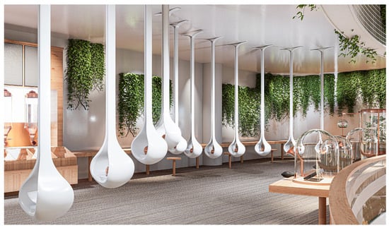 Olfaction and gustation are often overlooked in interior design; however, they play a distinctive role in shaping spatial experiences. Studies on olfaction and gustation have shown that they can significantly influence human emotions and memory []. For example, the sweet scent of candies in a candy store can evoke memories of carefree childhood moments. Although less prominent than vision and hearing, olfaction and gustation can leave a lasting impression on memory within a space. For example, in The Poetics of Space, Bachelard illustrated how the scent of a single raisin in a space can evoke an entirely different atmosphere within the realm of human imagination []. At times, visual elements can also be translated into gustatory experiences. For instance, C. Spence, in The Perfect Meal: The Multisensory Science of Food and Dining, discussed a study where researchers served the same flavored foods (such as desserts) on plates of different shapes. The findings revealed that participants were more likely to perceive desserts on round plates as sweeter, while those served on plates with sharp edges were described as having a more “pungent” or “bitter” taste []. Therefore, designers should recognize the subtle role of olfaction and gustation in spatial experiences and make use of these senses to add greater depth and emotional dimension to a space.