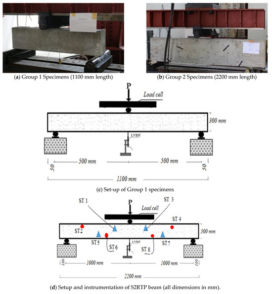 The experimental setup was constructed at Taif University (Taif, Saudi Arabia) using a 3D steel frame. Beams were simply supported via 80 mm steel rods resting in steel slots. A 2000 kN hydraulic jack applied load through an H.E.B.300 I-beam (see Figure 5). A central point load was applied at mid-span with load increments until failure. Deflection was measured with LVDTs and dial gauges, while strain was monitored using eight strain gauges placed on beam S2m-RTP. Strain gauges ST1–ST4 recorded compression, and ST5–ST8 recorded tension. Displacement-controlled loading was used at a rate of 0.01 mm/s to maintain consistency. External disturbances were minimized.