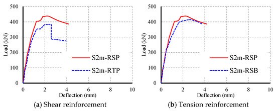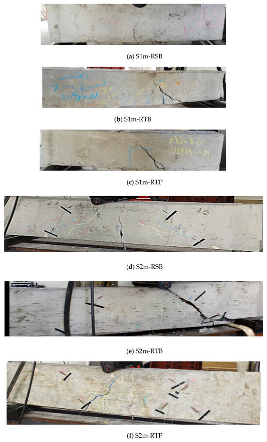 In contrast, flexural failure dominated the behavior of the conventionally reinforced beam (S2m-RSB), as depicted in Figure 6a,d. Flexural failure occurs due to excessive bending, which leads to progressive cracking and eventual failure when the flexural capacity is exceeded. This type of failure is typical in beams with insufficient flexural reinforcement or under excessive loading conditions.