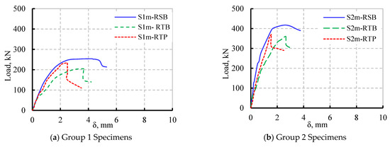 To evaluate the stiffness of each specimen during loading, load–deflection curves were analyzed to characterize the structural behavior of the beams. The experimentally obtained load–deflection responses for all tested specimens are presented in Figure 7. The load gradually increases until the beam reaches its maximum capacity or fails. Figure 7 shows that the initial slopes of all specimens are practically identical. The beams in Group 1 experienced lower stiffness than the corresponding one in Group 2, and the global flexural elasticity modulus of the Group 2 beams was higher (Figure 7). Consequently, the inclusion of steel plates and truss bars had a minimal influence on the stiffness of the concrete beam as the area of the steel plate is slightly less than the three replaced steel bars (14 mm in diameter) in Group 2 (Figure 7b). The effect of this slight difference was not responsible for the reduction in the beam S2m-RTP, as the failure was shear. This observation is further supported by the performance of beam S2m-RTB, which had a tensile reinforcement configuration identical to S2m-RSB, yet exhibited similar load capacity and shear failure to S2m-RTP (Figure 2). The lower stiffness of both beams S2m-RSB and S2m- RTB may be because of the low shear reinforcement area in those beams compared to S2m-RSB. The three beams had nearly initial stiffness; afterward, the beam stirrups could allow the beam to have higher stiffness than the beams with truss bars. The higher area of stirrups compared to truss bars reduced the beam deflection caused due to shear cracking, so it enhanced its global stiffness. A similar trend was observed in Group 1 beams, albeit with less pronounced differences (Figure 1a). The replacement of three steel bars (12 mm diameter, beam S1m-RTB) with two 10 mm in diameter steel bars and a 3 mm steel plate (beam S1m-RTP) increased the tensile reinforcement by 33%. This increment could enhance the stiffness of beam S1m-RTP and capacity as the tensile reinforcement could enhance the beam shear capacity.