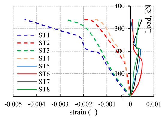 As the applied load increases, the beam enters the crack propagation stage. Within the 0–150 kN load range, significant increases in strain were recorded by gauges ST2 and ST4, indicating active crack extension. Furthermore, gauges ST6 and ST8 exhibited higher deformation levels and responded earlier, within the 0–100 kN range, suggesting that cracking in those regions initiated sooner and progressed more rapidly. These localized strain responses highlight the varying stress distribution along the beam and underscore the influence of reinforcement configuration on crack development and failure behavior.