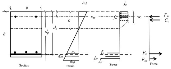 where fs, fsc, Cc, and Ct are forces in bottom steel, top steel, concrete at the compression side, and concrete at the tension side, respectively. In the case of the bottom steel plate used as bottom reinforcement, Equation (8) is used.