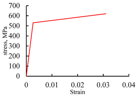 The next phase of the plate-yielding study involves utilizing the beam reinforcement configuration model consisting of steel plates and stirrups. The objective was to validate the findings from the initial stage and observe the performance of the steel plates and bars under loading conditions. Figure 18a,b demonstrate that the stresses on the plate and the tensile bars in the model were closely aligned, reaching the yielding stress after the elastic loading stage.