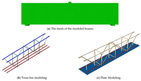 Moreover, as illustrated in Figure 14b, the beam reinforced with a steel plate and stirrups performed slightly better than one reinforced with steel bars and stirrups, despite the plate’s 20% lower yield strength. This emphasizes the need to further investigate the yielding behavior of steel plates and its influence on overall capacity. The results suggest that the truss bar configuration was less effective in resisting shear over the full span. Future research is recommended to explore alternative truss geometries, such as N-shaped trusses, to enhance shear performance.