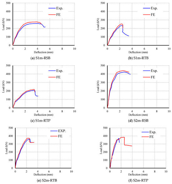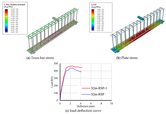 Figure 14 illustrates a comparison between FE and experimental P-δ curves, while Table 6 shows the loads and failure mode comparison of the simulated beams. The P-δ curves, load capacities, and failure characteristics (cracks and failure modes) of the FE findings were compared to their corresponding experimental ones. The developed FE models could capture, with good precision, the experimental load capacities, load–deflection curves, and modes of failure (Table 6 and Figure 14 and Figure 15). The average ratio between the FE and the experimental load capacity was 105.7% with a standard deviation of ±2.0. Moreover, Figure 16 illustrates the stress imposed on the truss bar at the termination of the crack development phases, indicating that the truss can withstand a certain proportion of the applied shear stress. Additionally, Figure 16b showcases a comparison between FE cracks and experimental crack mapping of the tested beam S1m-RTP. The results indicated that the FE model could capture nearly identical behaviors and crack patterns of the tested beams, with only a tiny difference observed in load and stiffness, which was due to the presence of internal defects and voids in the experimental specimens. Therefore, based on these results, the FE model successfully simulated RC beams.