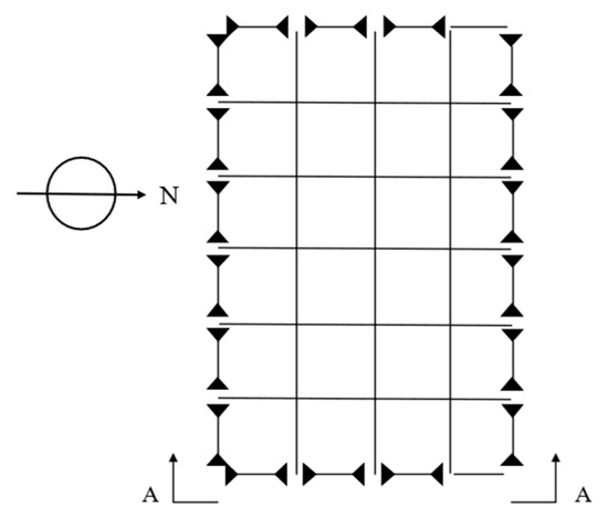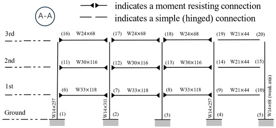 To validate the predictive performance of the DG-SVM model, this study selects a three-story steel structure building designed as part of the SAC project in Los Angeles, California [34]. The building’s floor plan is shown in Figure 1. The building has a total floor area of 6019.65 m2, with each standard floor measuring 36.58 m in length, 54.87 m in width, and 3.96 m in height. The structural height of the main framework is 11.89 m. The structure has spans of 9.15 m in both principal directions, with six spans in the east–west direction and four spans in the north–south (N-S) direction. The elevation view of the framework is illustrated in Figure 2. It should be noted that the left corner column in this building may experience torsional response under a bidirectional loading as indicated in [35]. However, we only consider a unidirectional dynamic loading case, with one frame depicted in Figure 2 serving as the numerical example, as illustrated in [34].