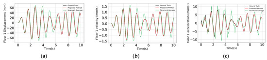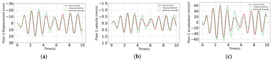 Figure 3, Figure 4 and Figure 5 illustrate the comparative time history responses of displacement, velocity, and acceleration for each floor of the structure obtained using the Newmark average acceleration method and the DG-SVM model with a time step size of 0.1 s. Figure 6 presents the comparison of the maximum inter-story drift angles obtained by the four methods and the analytical solution at various time step sizes, including 0.01 s, 0.02 s, 0.03 s, 0.04 s, 0.05 s, 0.06 s, 0.07 s, 0.08 s, 0.09 s, and 0.1 s. Figure 7 provides a detailed comparison of the performance metrics, including R2, RMSE, MAE, and computational time, for the displacement response obtained by the four methods during the dynamic time history analysis at various time step sizes.