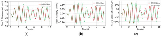 Comparison graphs of displacement, velocity, and acceleration of the third floor structure: Newmark average acceleration method and DG-SVM method versus analytical solution. (a) Displacement; (b) velocity; (c) acceleration.