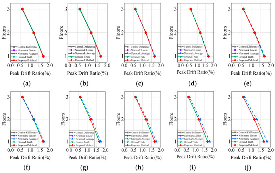 Comparison of peak drift ratio results of four methods under different time steps. (a) ; (b) ; (c) ; (d) ; (e) ; (f) ; (g) ; (h) (i) (j) .