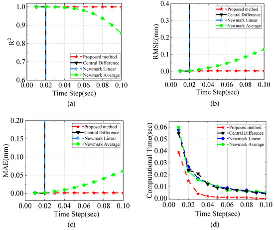 The analysis of Figure 7 reveals that the central difference method and the Newmark linear acceleration method encounter stability issues when the time step size exceeds 0.02 s, rendering their coefficient of determination (R2), root mean square error (RMSE), and mean absolute error (MAE) values unreasonable. Figure 7a illustrates that the R2 value of the Newmark average acceleration method decreases as the time step size increases, reaching 0.8576 at a time step size of 0.1 s, whereas the R2 value of the proposed DG-SVM method consistently remains at 0.9999. Figure 7b illustrates that the RMSE value of the Newmark average acceleration method increases as the time step size grows, reaching 0.1287 mm at a time step size of 0.1 s, whereas the RMSE value of the DG-SVM method consistently remains at 0.0023 mm, indicating that the difference between its numerical solution and the analytical solution is minimally affected by the time step size. Figure 7c illustrates that the MAE value of the Newmark average acceleration method similarly increases with the time step size, reaching 0.0611 mm at a time step size of 0.1 s, whereas the DG-SVM method maintains a high computational accuracy across different time step sizes, with its MAE value consistently stabilized at 0.0011 mm. The above results demonstrate that the computational accuracy of the DG-SVM model is less sensitive to the time step size, whereas the computational accuracy of the central difference method and the Newmark methods is significantly affected by the time step size. Figure 7d indicates that the computational time of both the classical methods and the DG-SVM model decreases exponentially with increasing time step size. Among the four methods, the DG-SVM model consistently exhibits the lowest computational time across different time step sizes, demonstrating its superior computational efficiency compared to the classical methods. Compared to the classical methods, the DG-SVM model achieves approximately 1.4 times computational acceleration at a time step of 0.01 s. When the time step size increases to 0.1 s, the DG-SVM model achieves approximately 40 times computational acceleration. Considering that the computational accuracy of the DG-SVM model at larger time step sizes (e.g., 0.1 s) is comparable to that of the classical methods at smaller time step sizes (e.g., 0.01 s) (see Figure 7a–c), the DG-SVM model provides approximately 540 times computational acceleration under these conditions. The following tables provide a comparative analysis of displacement responses among four methods under varying time steps. Specifically, Table 3 presents the R2 values, Table 4 shows the mean absolute error (MAE) values, and Table 5 provides the root mean square error (RMSE) values. These metrics are used to evaluate the accuracy and reliability of each method in predicting displacement responses.