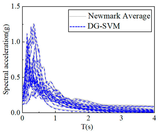Additionally, this study only considers the sinusoidal excitation because of its analytical solution that is available. For more complicated random excitations that cannot be expressed by a continuous function, such as ground motions, there is no analytical solution provided. In this sense, if ground motions are employed as dynamic excitation, there is no analytical solution that serves as the benchmark to compare with numerical solutions computed by classical time integration methods. However, the proposed DG-SVM model still works for these complicated random excitations. To demonstrate this, the proposed DG-SVM model is utilized to compute the response spectrum for 20 ground motion records with a time step size of 0.05. The benchmark is obtained by the Newmark average acceleration method with a smaller time step size of 0.01. The comparison of results is presented below. By observation, the results obtained by the proposed DG-SVM model agree very well with those computed by the Newmark average acceleration method, demonstrating its practical application. The comparison in Figure 8 shows the ground motion response spectra obtained using the DG-SVM method and the Newmark average method, along with the actual seismic response.