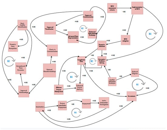 B1 and B2 (BIM Adoption and Proactive Problem Solving): BIM adoption complements proactive strategies by enabling early clash detection and conflict resolution. Together, these loops stabilize projects and minimize risks.