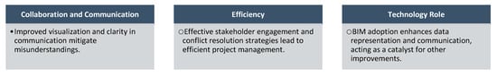 The findings emphasize the importance of balancing technology, communication, and stakeholder relationships to achieve successful project outcomes. BIM is a central enabler, driving improvements across all these areas by providing tools for proactive planning and efficient management. Balancing proactive strategies, such as early conflict detection, with dynamic feedback from stakeholders is essential for creating a stable and efficient system.